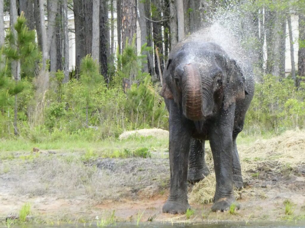 Asian elephants are the largest living land mammal in Asia and the second-largest in the world behind African elephants. On average, males stand 9 ft. tall at the shoulder and weigh up to 12,000 lbs. Unlike African elephants, only male Asian elephants have tusks. Besides their tusks, elephants are distinctive due to their trunks. The trunk is an elongation of the nose and upper lip combined, with the nostrils at the tip. The trunk contains as many as 60,000 muscles, and in the case of Asian elephants, there is one finger-like projection at the end of it. Elephants use their trunks for breathing, watering, feeding, touching, dusting, washing, grasping, sound production and communication, and playing.